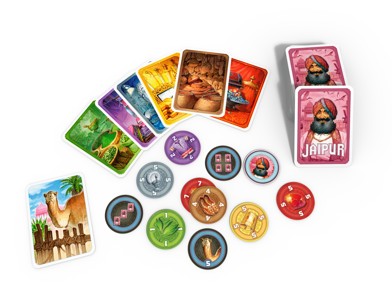 Jaipur... La vostra aspirazione è quella di diventare il mercante personale del Maharaja arricchendovi più del vostro avversario alla fine di ogni settimana (round). Per farlo, accumulate e scambiate le merci (carte) al mercato, poi vendetele in cambio di rupie (sul retro dei segnalini). Se riuscite a concludere un ottimo affare (tre carte o più), riceverete una ricompensa (un segnalino bonus). Quanto ai cammelli, li utilizzerete principalmente per gli scambi in cui desiderate prendere più merci al mercato.