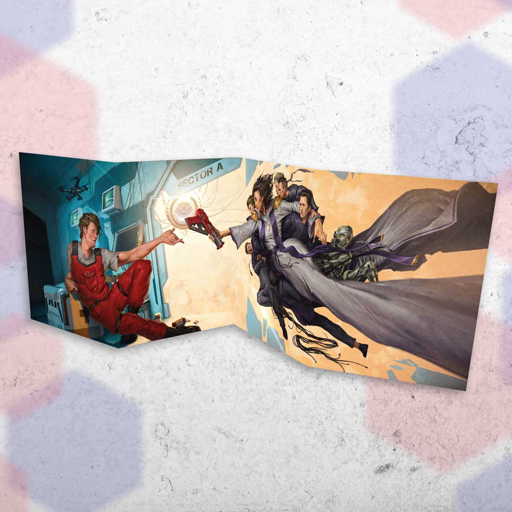 Uno schermo a quattro ante con linee guida, armi, rivalità e regole sulle società segrete stampate sul lato interno, per aiutare il GM ad uccidere meglio creare incredibili avventure e celare i vostri malvagi benevoli piani agli occhi dei giocatori curiosi!