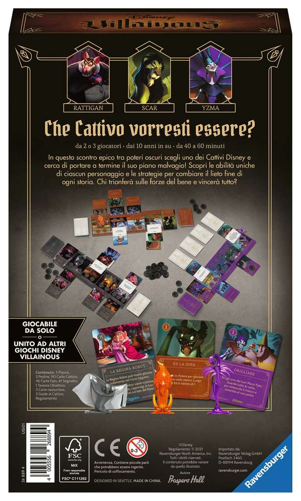 Con questa versione di Disney Villainous Evil Comes Prepared diventa un Cattivo Disney! Scegli tra i tre famosi Cattivi Disney: Scar, Yzma e Rattigan e immedesimati nel loro personaggio. Per vincere, devi esplorare le abilità uniche del tuo personaggio e scoprire come raggiungere il tuo obiettivo personale, legato alla storia del tuo Cattivo. Ogni Guida al Cattivo ti fornirà suggerimenti e strategie per raggiungere la vittoria. Una volta che avrai scoperto il modo migliore per giocare interpretando un determinato Cattivo, prova a risolverne un altro. I tre Cattivi presenti in questa espansione hanno ognuno dei modi diversi per raggiungere la vittoria!